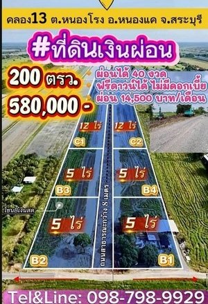 ที่ดินเงินผ่อน คลอง13 ต.หนองโรง อ.หนองแค จ.สระบุรี 200 ตรว.580,000 บาท