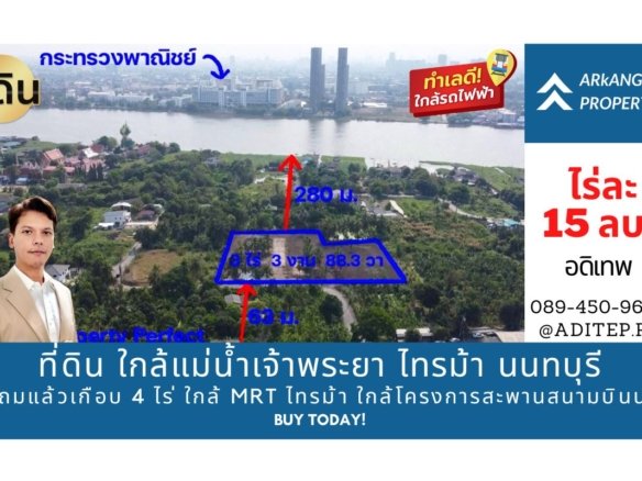 ขายที่ดิน ใกล้แม่น้ําเจ้าพระยา ซ.ไทรม้า 5 นนทบุรี ที่ถมแล้วเกือบ 4 ไร่ ใกล้รถไฟฟ้า ใกล้โครงการสะพานสนามบินน้ำ