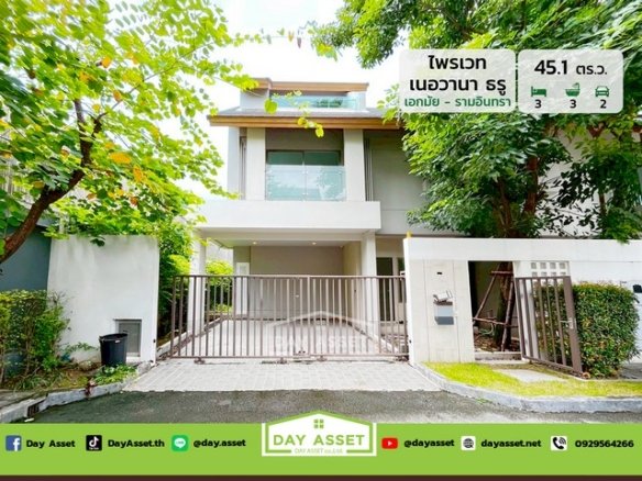 ขายบ้านแฝด 3 ชั้น หมู่บ้านไพรเวท เนอวานา ธรู เอกมัย-รามอินทรา ทำเลดีใกล้ทางด่วน เนื้อที่ 45.1 ตร.ว. ขายเพียง 15,500,000 ล้านบาท