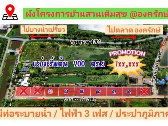 ขายที่ดินบ้านสวนเกษตร แบ่งแปลงขาย บ้านสวนเติมสุข อ.องครักษ์ จ.นครนายก ใกล้ มศว.องครักษ์ เพียง 5.6 กม.