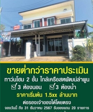 ขายทาวน์โฮม 2ชั้น 1.5XXลบ.,ทาวน์โฮมออฟฟิศ 2ชั้น, ต่ำกว่าประเมิน ฟรีโอน ทำเลทอง ต.ป่าสัก อ.เมือง ลำพูน