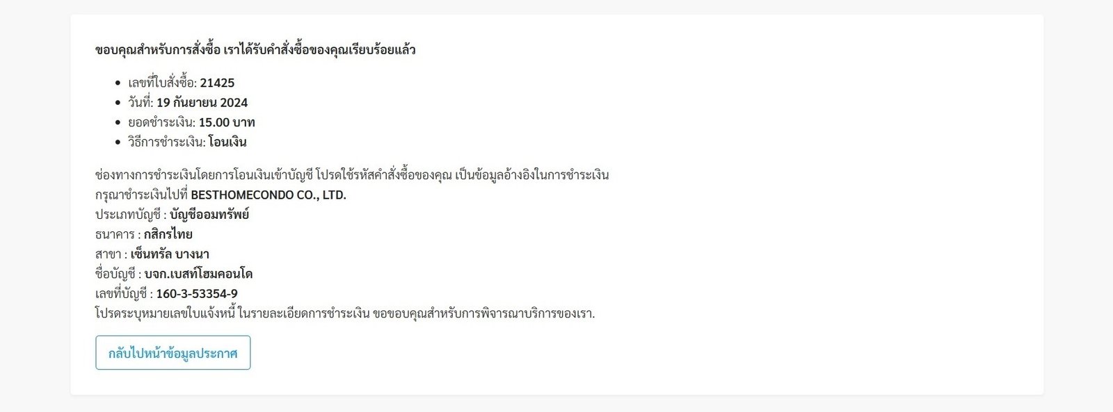 เมื่อลูกค้ากดยืนยันการชำระเงินแล้ว คุณจะได้รับรายละเอียดการชำระเงินเงินในหน้าถัดไป โดยจะแสดงข้อมูล