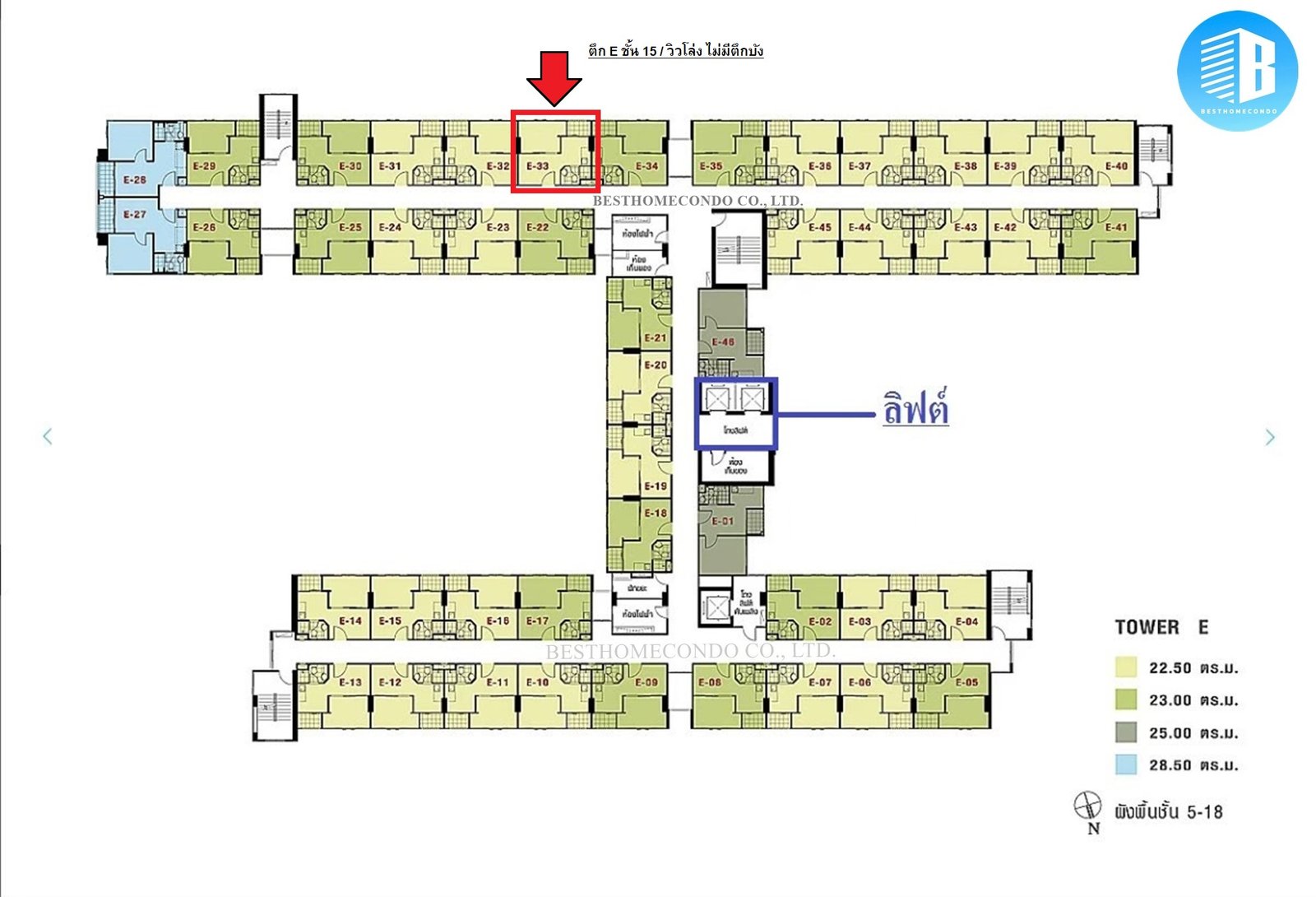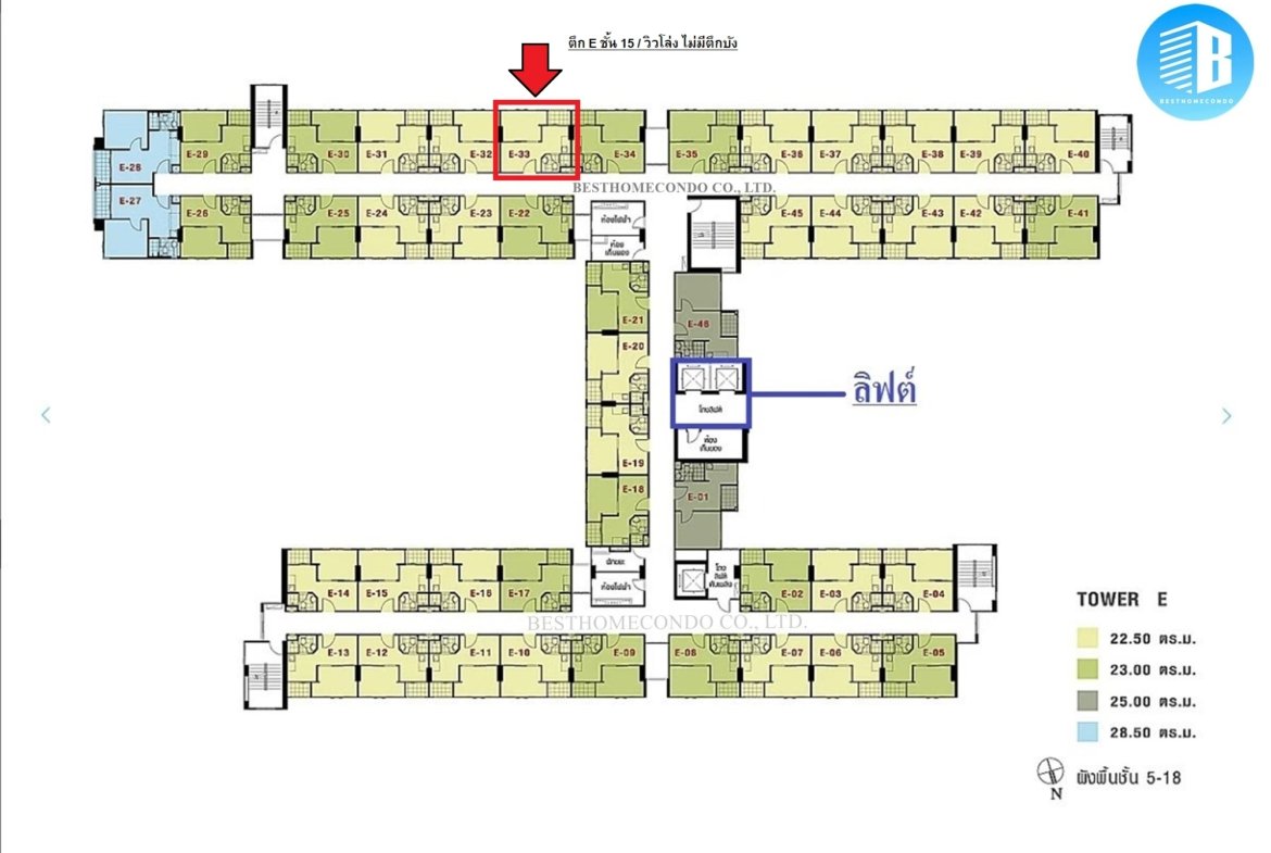 ขนาด 23 ตร.ม. ชั้น 15 ตึก E / 1 ห้องนอน 1 ห้องน้ำ