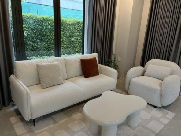 ผนังสีขาวครีมช่วยเพิ่มแสงสว่าง งานบิลท์อินไม้และกระจกใสเต็มบานเพิ่มมิติพื้นที่