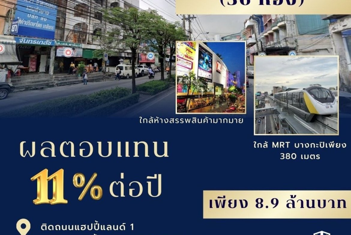 ขายหอพัก 36 ห้อง ผลตอบแทน 11% ต่อปี เนื้อที่ 36 ตรว. ติดถนนแฮปปี้แลนด์ 1 ใกล้ MRT บางกะปิเพียง 380 เมตร คลองจั่น เขตบางกะปิ กรุงเทพ
