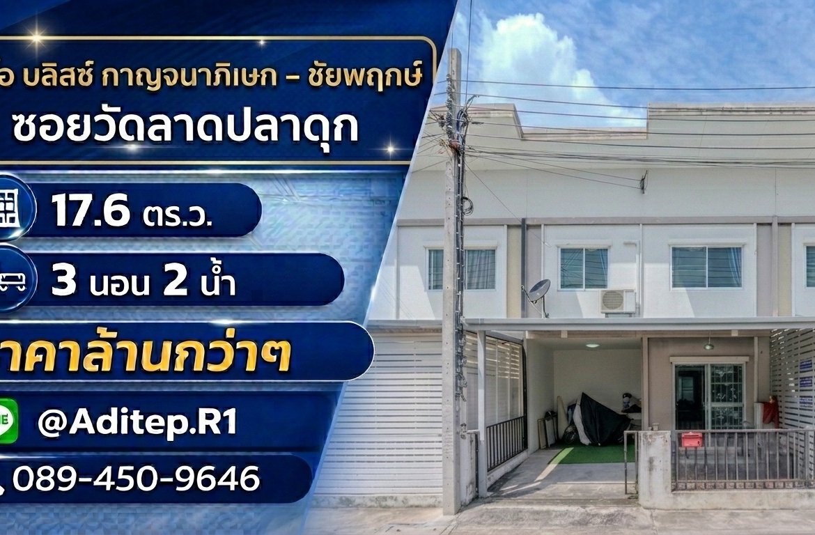 ทาวน์เฮ้าส์ 2 ชั้น หน้ากว้าง 5.7 เมตร จากโครงการ **ไลโอ บลิสซ์ กาญจนาภิเษก–ชัยพฤกษ์** ผลงานของ **ลลิล พร็อพเพอร์ตี้** บนทำเลบางบัวทอง–บางรักพัฒนา ซอยวัดลาดปลาดุก จังหวัดนนทบุรี บ้านพร้อมอยู่ทันที แถมเฟอร์นิเจอร์ + **แอร์ 2 เครื่อง** ไม่ต้องลงทุนเพิ่ม เริ่มต้นชีวิตใหม่ได้เลยวันโอน
