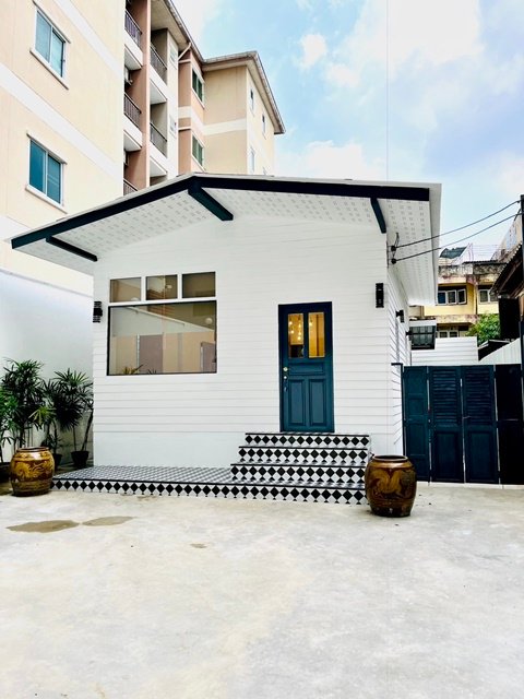 บ้านชั้นเดียวขนาดกะทัดรัด เหมาะสำหรับอยู่อาศัยในเมือง ซอยกว้างประมาณ 1.5 เมตร เข้าได้แต่จอดรถจักรยานยนต์ รถยนต์เข้าไม่ได้