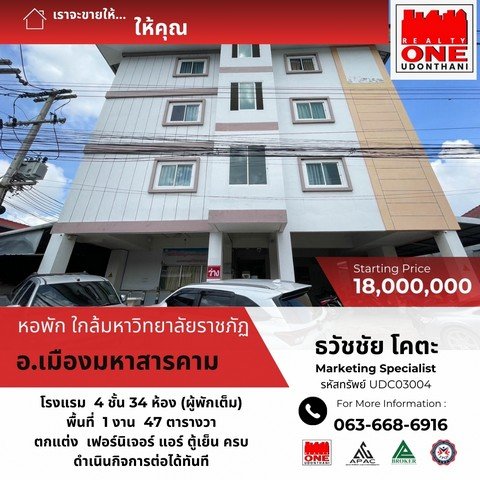 หอพักทำเลทอง ใกล้มหาวิทยาลัยราชภัฏมหาสารคาม 4 ชั้น 34 ห้อง