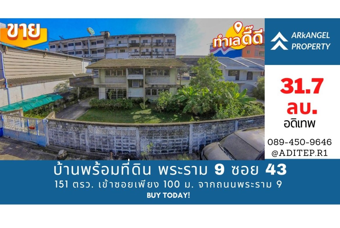 ขายบ้านพร้อมที่ดินแปลงใหญ่ ขนาด 151 ตรว. **ทำเลทอง ใจกลางเมือง ตั้งอยู่บนถนนพระราม 9 ซอย 43