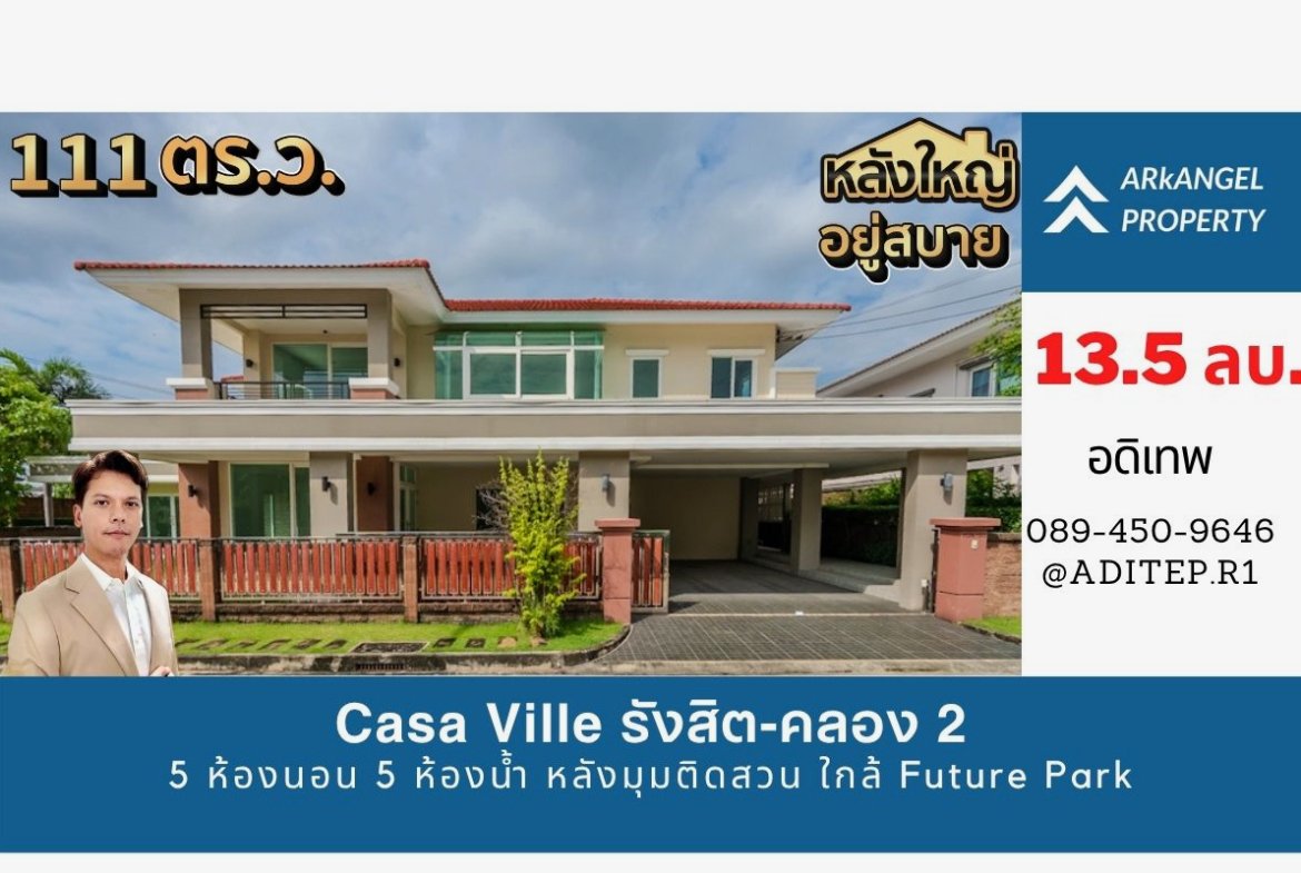 ขายบ้านเดี่ยว Casa Ville รังสิต–คลอง 2 หลังมุม 111 ตรว. 5 ห้องนอน 5 ห้องน้ำ ใกล้ Future Park ติดถนนรังสิต–นครนายก เหมาะสำหรับครอบครัวใหญ่